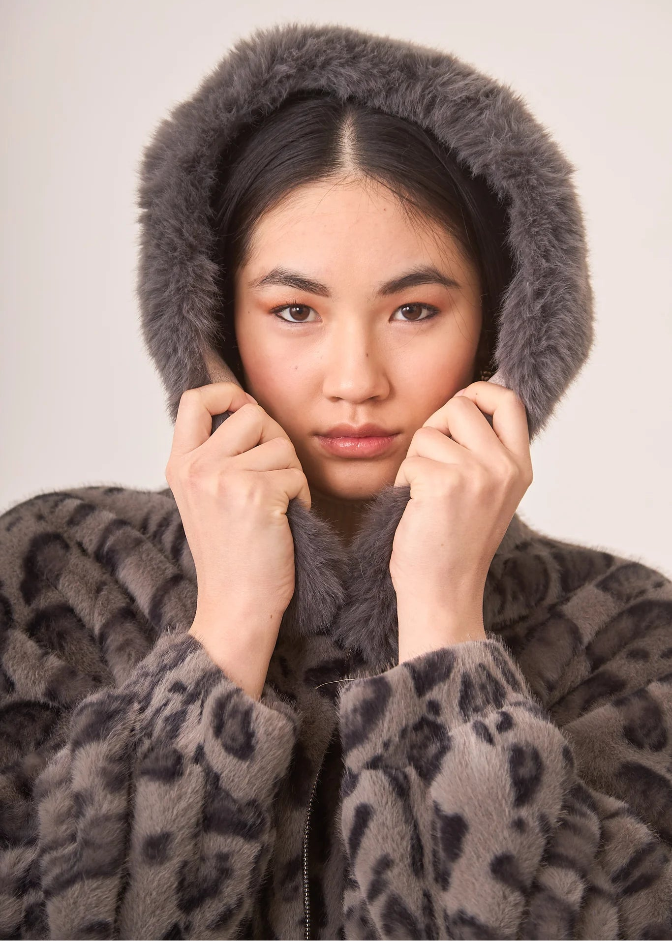 Abrigo corto de pelo estampado con print animal. Con capucha y bolsillos. Cierre de cremallera.