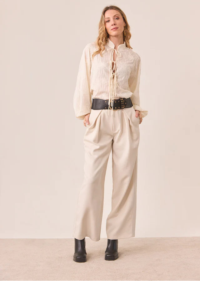 Blusa de manga larga con cuello camisero. Cierre frontal con lazo. Detalles bordados.