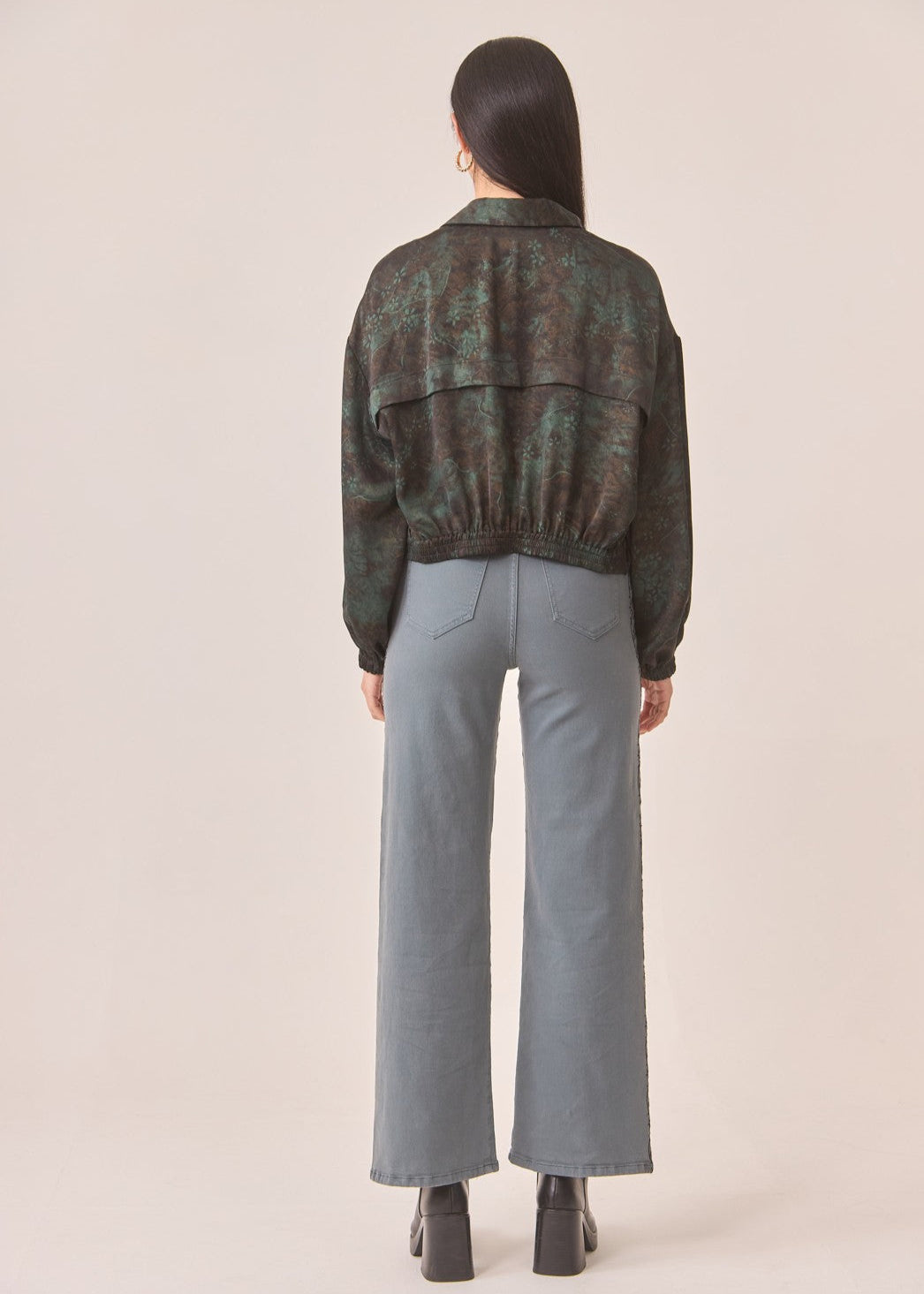 Blusa corta de manga larga con cuello camisero y cierre con lazos en el frontal.