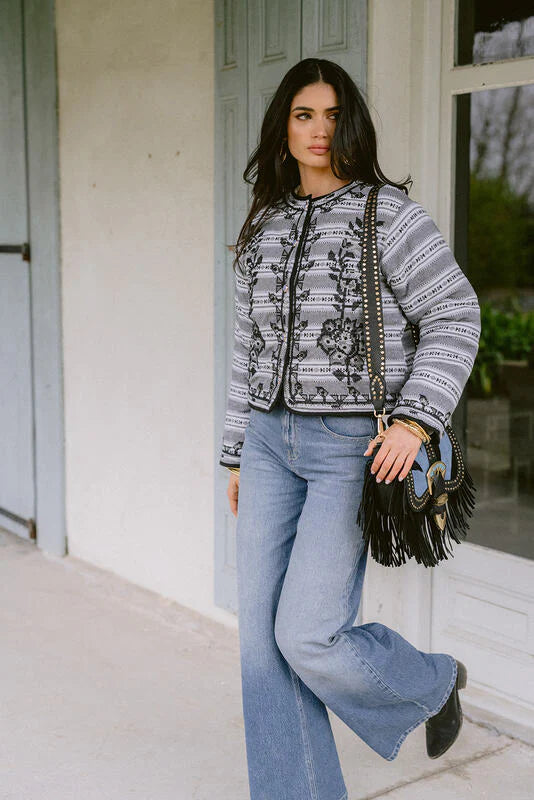Bolso tipo bandolera con flecos y hebilla metálica en frente.