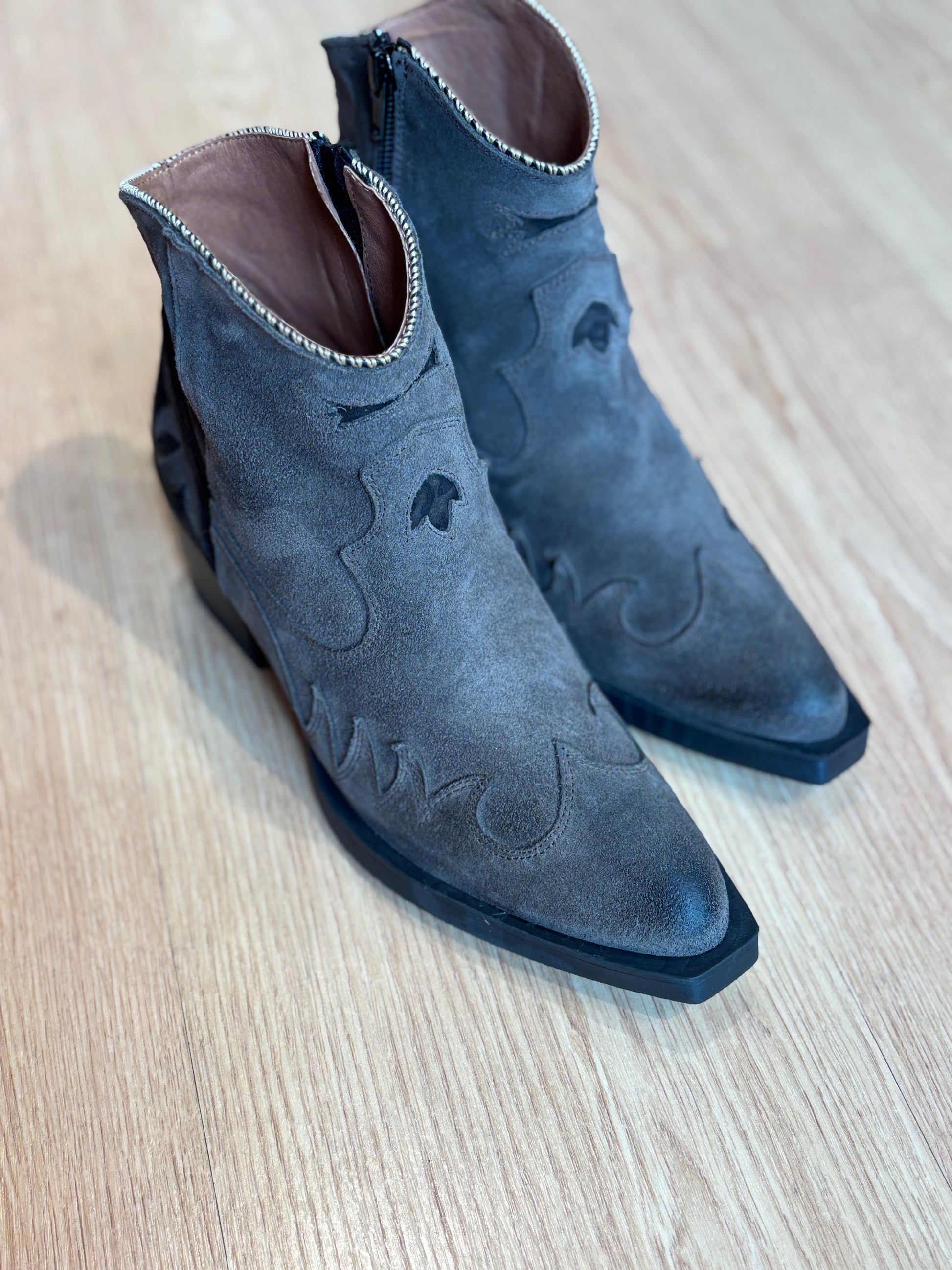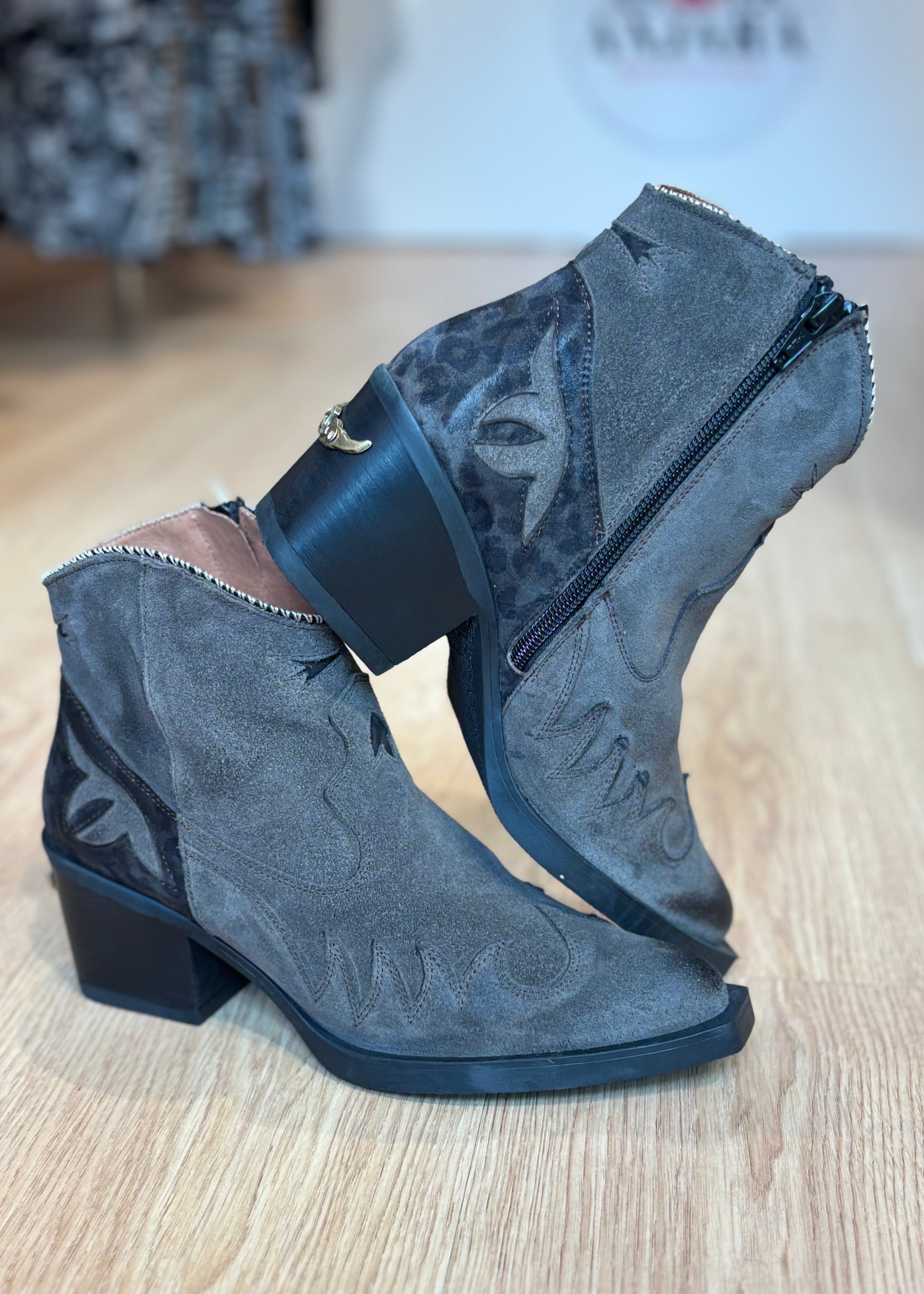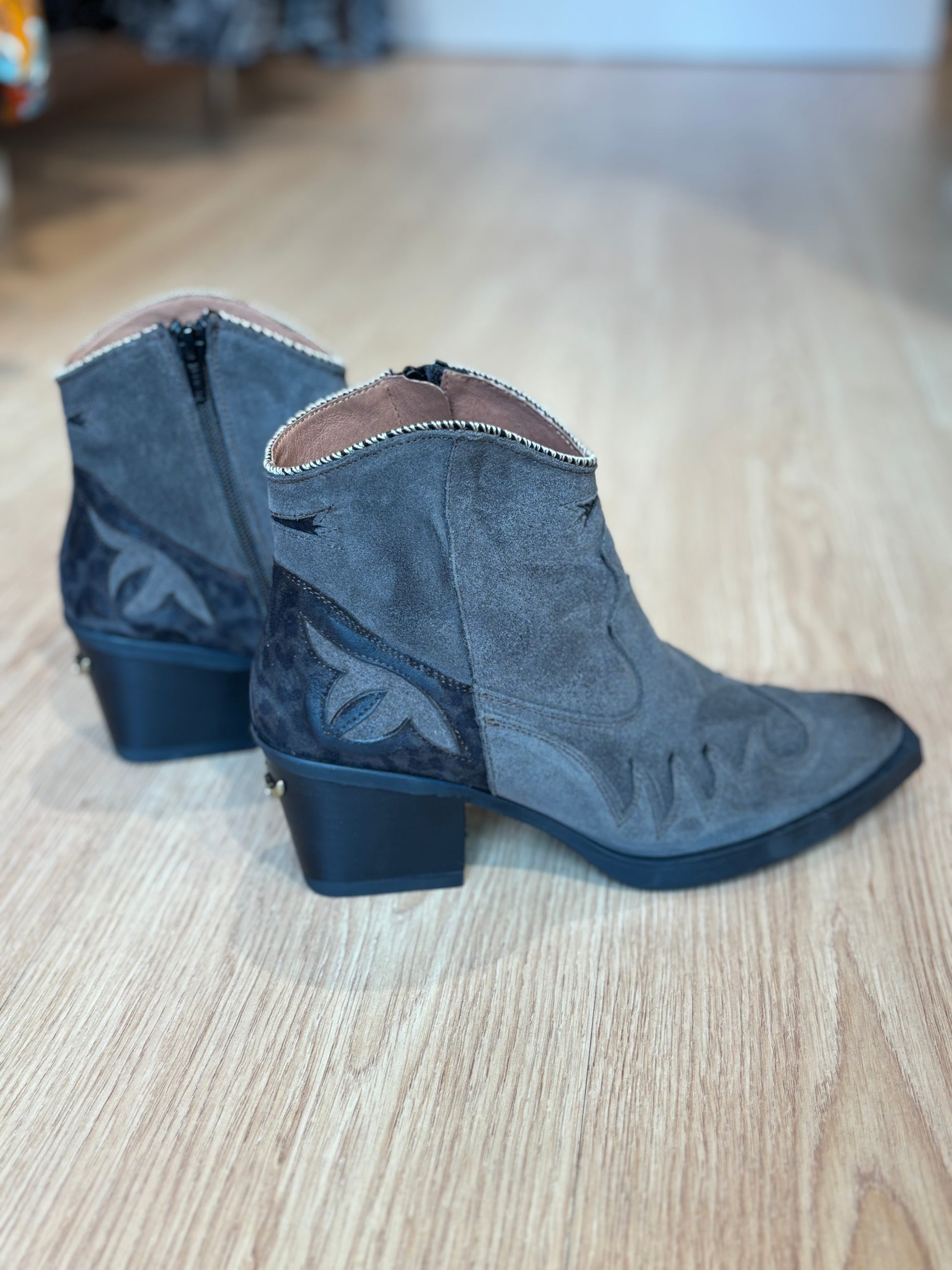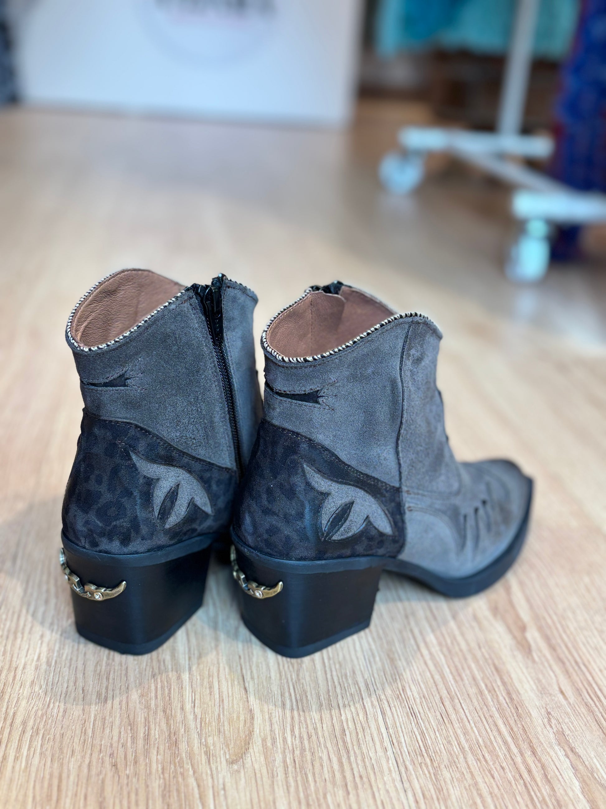 Botines de piel girada grises con detalles print animal. Hecho a mano artesanalmente en España.