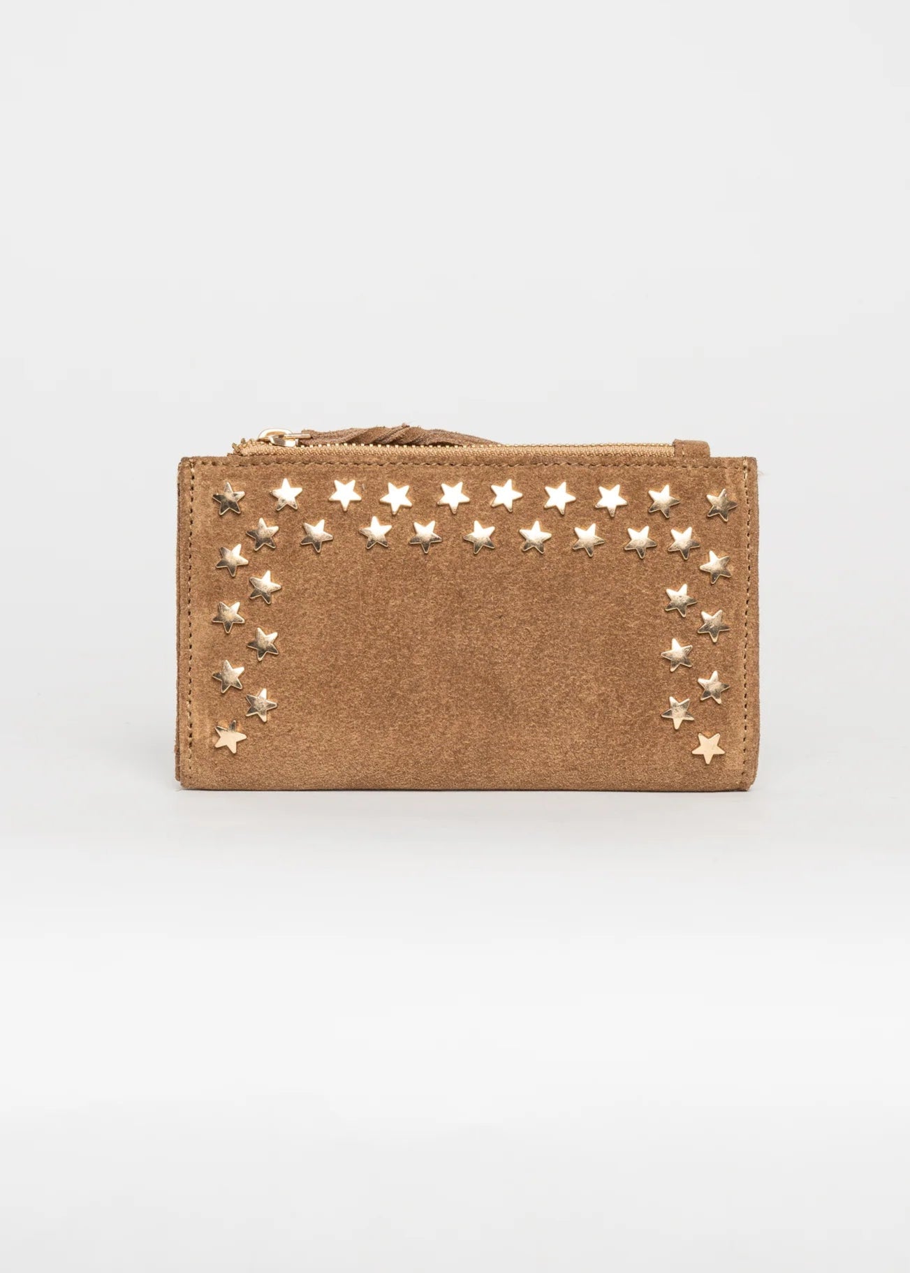 Cartera de piel serraje en color camel, con cremallera y compartimentos.