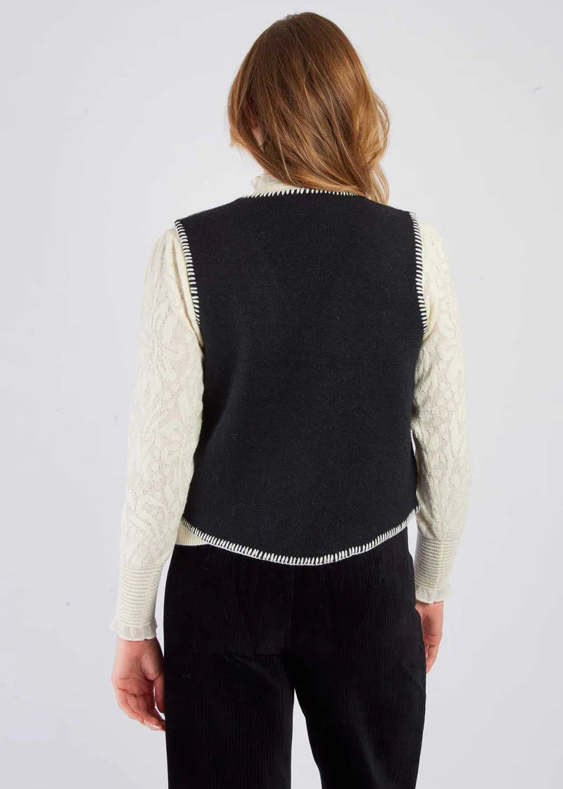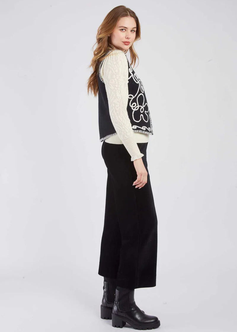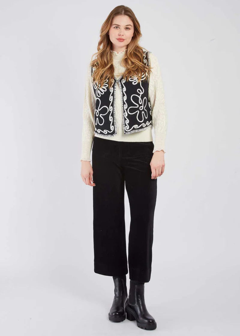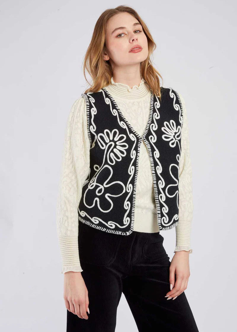 Cárdigan de punto tupido con diseño floral de punto para un sutil efecto texturizado. Acabado en punto festón para un detalle impecable. Corte recto y sin mangas, perfecto para combinar con otras prendas en entretiempo o para añadir un toque de estilo a cualquier conjunto.