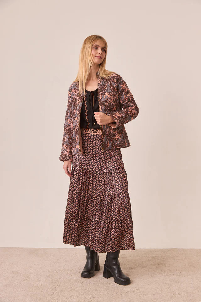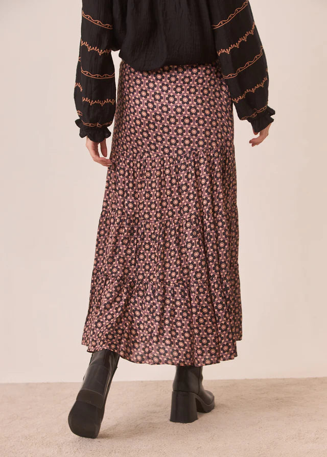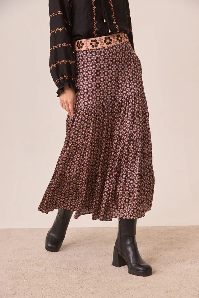 Falda larga con estampado fluido. Cinturilla con detalle bordado.