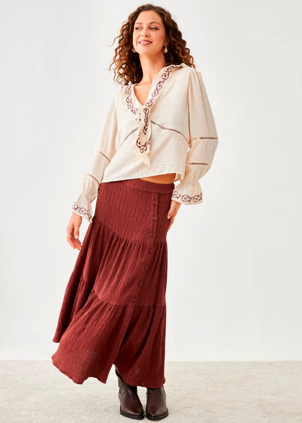 Falda larga burdeos plisada con botones laterales y dos volantes en el bajo.