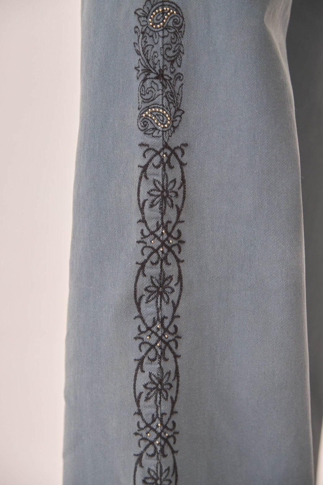 Pantalón en tejido denim de tiro medio recto con detalle de bordado lateral. Cierre de botón y cremallera.