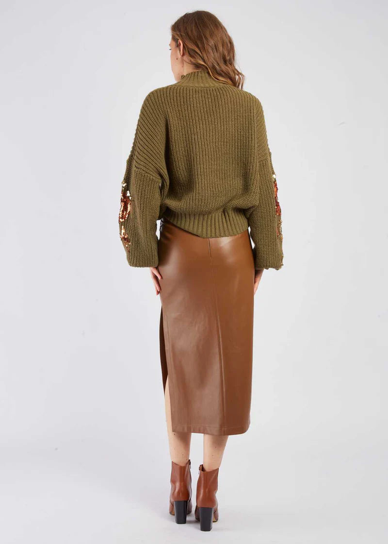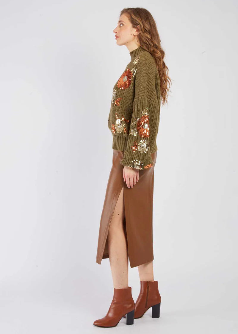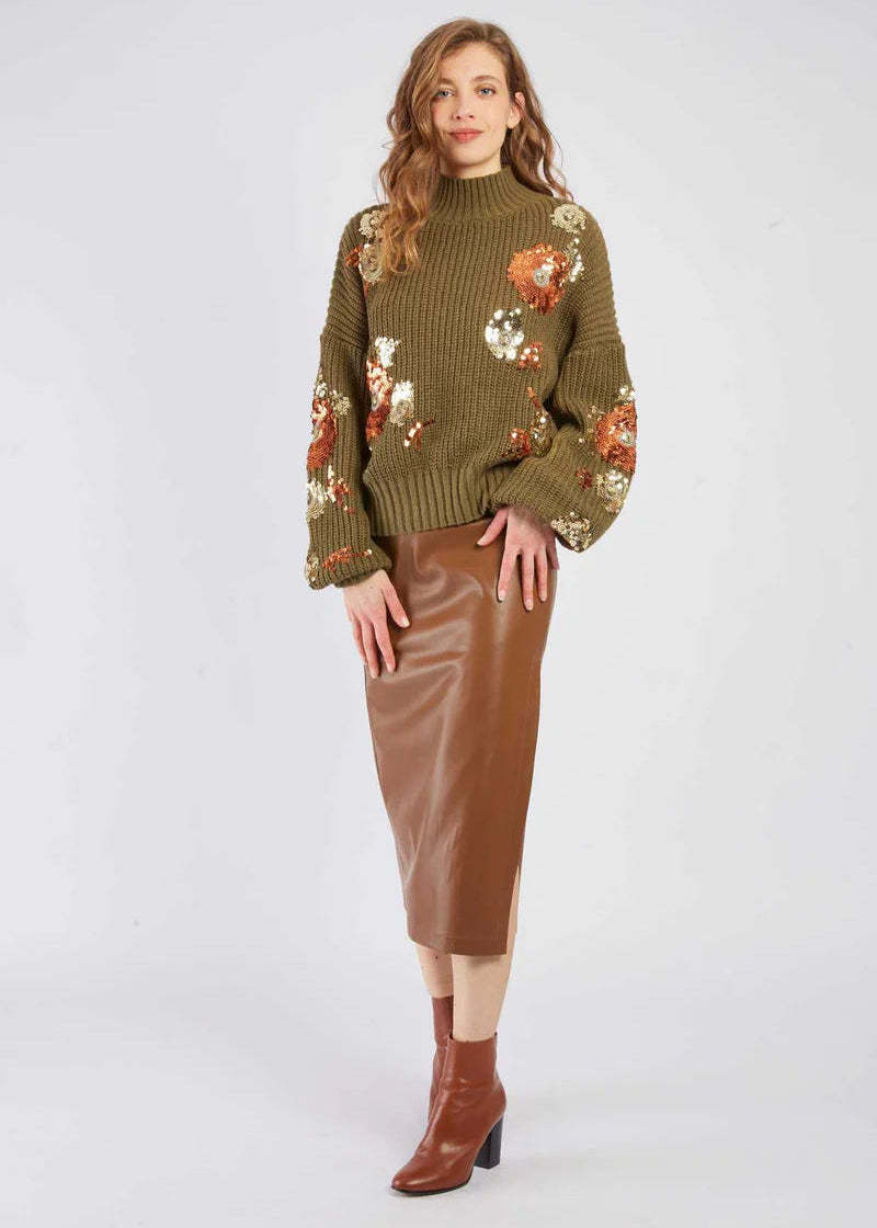 Suéter de punto grueso con ribete de cuentas para una textura delicada. Un motivo floral con lentejuelas brillantes le da un toque elegante y festivo. El cuello redondo y las mangas largas ofrecen un ajuste cómodo y femenino. Perfecto para salir por la noche o para un look casual y elegante en climas más frescos.