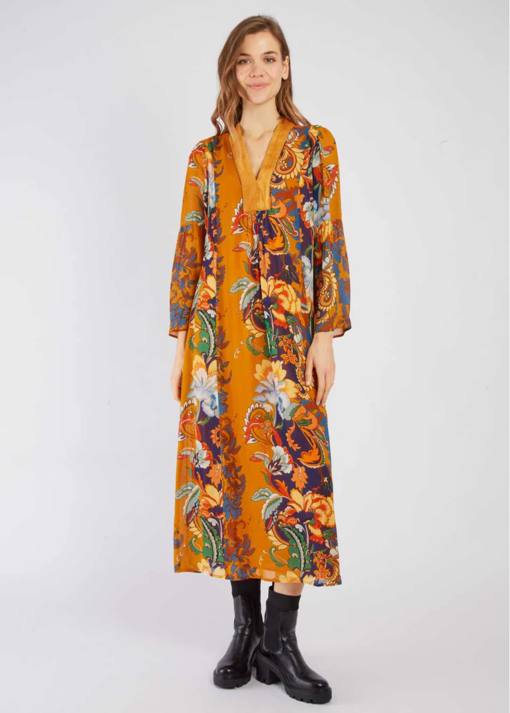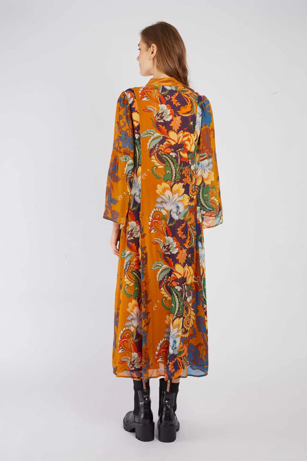 Vestido largo y fluido de viscosa estampada, perfecto para un look bohemio y chic. Presenta un escote en V delicadamente realzado por un corte de terciopelo y mangas largas y anchas adornadas con volantes que le dan un efecto vaporoso. Forrado en algodón para mayor comodidad y transpirabilidad, este vestido combina elegancia y ligereza, ideal para entretiempo.