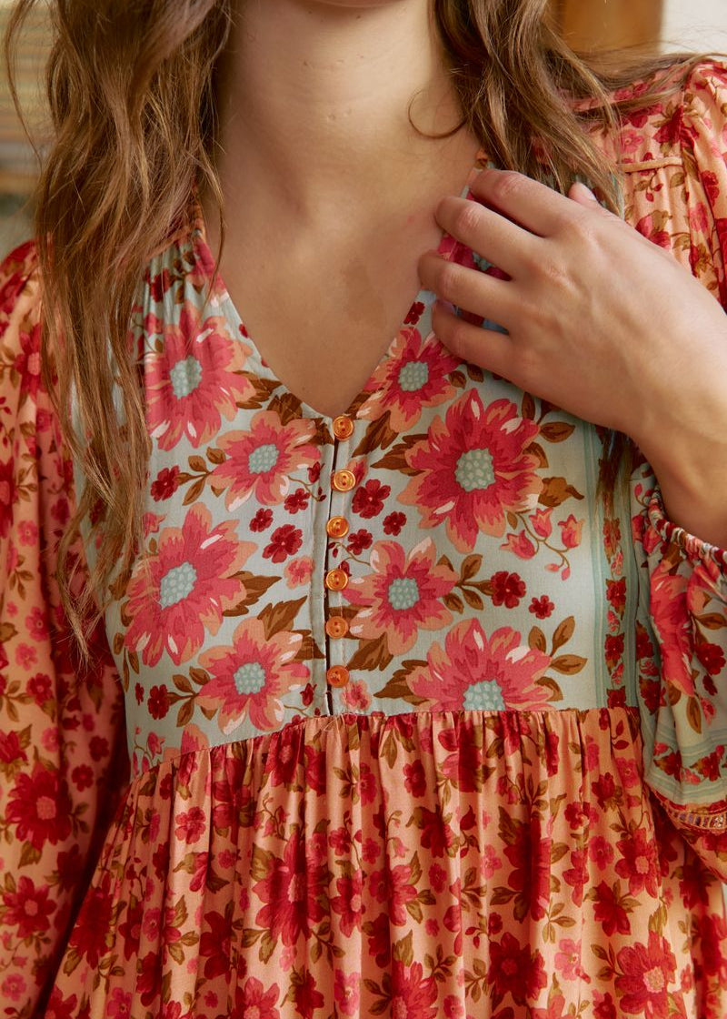 Luce radiante este invierno con nuestro vestido largo de rayón en tonos naranjas y un encantador estampado floral que aporta calidez y alegría a tus días fríos. Perfecto para un look femenino, moderno y lleno de vida durante la temporada otoño-invierno.